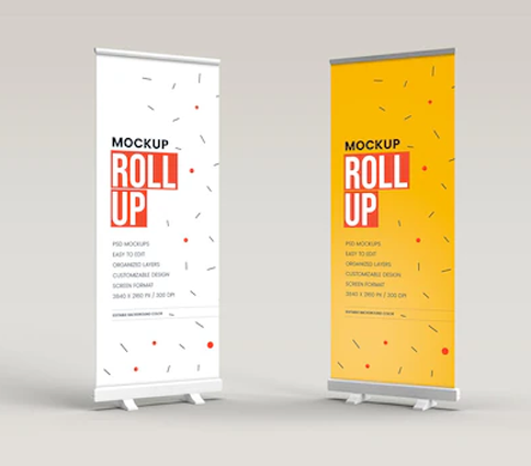 Roller Banners with vibrant PVC matte print, quick pull-up design, and carry bag—ideal for events, ads, and displays. Available in two portable sizes.
